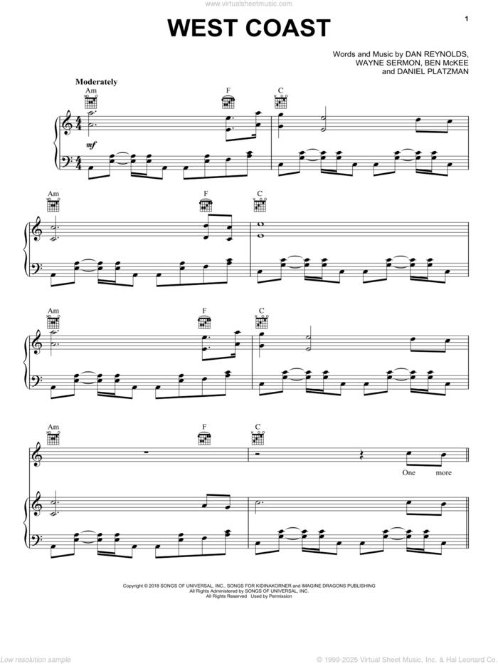 This new feature (still experimental) allows you to ask questions related to this music title to our AI music assistant (powered by OpenAI ChatGPT), trained to answer as an expert on this music title.You may ask questions like "When was this song written?" or "How would you suggest approaching this song?" You can also ask questions about the author or anything else you may think of. Just enter your queries inside the field on the top of the displayed music and click the "Ask" button on the left to start chatting. Remember that the assistant cannot perform catalog searches. It is focused only on this music title. It could also give you wrong or imperfect answers. In that case, click the "regenerate" button on the side of the answer to replace it with a new one. And, of course, you can provide feedback for each answer so we can improve the system. ![]() Imagine Dragons: West Coast for voice, piano or guitar, intermediate sheet music. High-Quality and Interactive, transposable in any key, play along. Includes an High-Quality PDF file to download instantly. Licensed to Virtual Sheet Music® by Hal Leonard® publishing company. NOTE: The sample above is just the first page preview of this item. Buy this item to display, print, and play the complete music. Basic Score Info