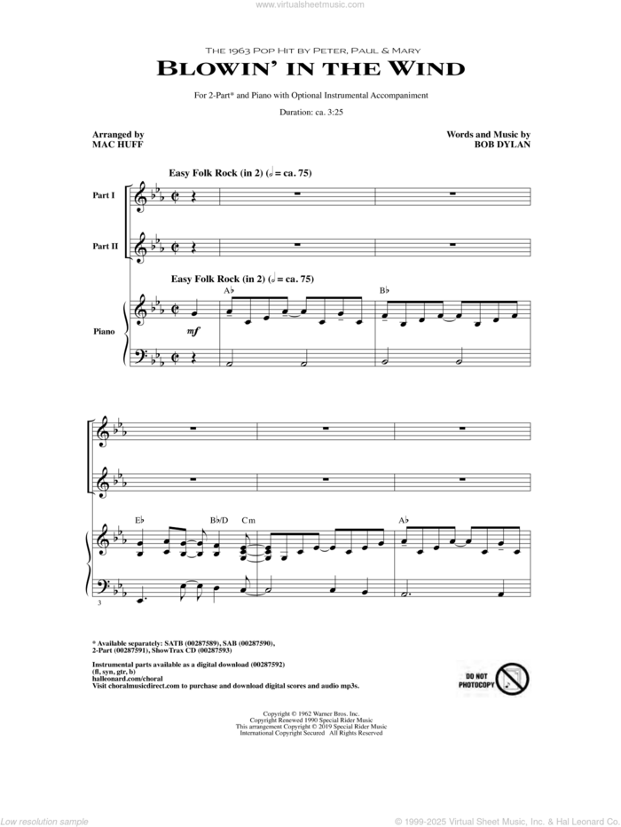 This new feature (still experimental) allows you to ask questions related to this music title to our AI music assistant (powered by OpenAI ChatGPT), trained to answer as an expert on this music title.You may ask questions like "When was this song written?" or "How would you suggest approaching this song?" You can also ask questions about the author or anything else you may think of. Just enter your queries inside the field on the top of the displayed music and click the "Ask" button on the left to start chatting. Remember that the assistant cannot perform catalog searches. It is focused only on this music title. It could also give you wrong or imperfect answers. In that case, click the "regenerate" button on the side of the answer to replace it with a new one. And, of course, you can provide feedback for each answer so we can improve the system. ![]() Peter, Paul & Mary: Blowin' In The Wind (arr. Mac Huff) for choir (2-Part), intermediate sheet music. Includes an High-Quality PDF file to download instantly. Licensed to Virtual Sheet Music® by Hal Leonard® publishing company. NOTE: The image above is just a preview of the first page of this item. Buy this item to display, print, and enjoy the complete music. Basic Score Info