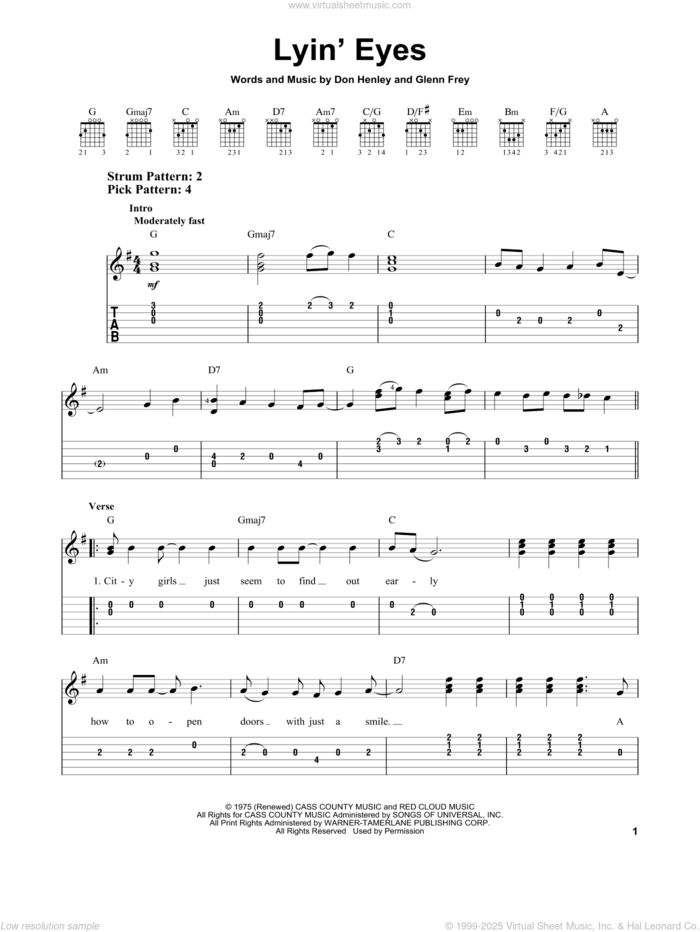 This new feature (still experimental) allows you to ask questions related to this music title to our AI music assistant (powered by OpenAI ChatGPT), trained to answer as an expert on this music title.You may ask questions like "When was this song written?" or "How would you suggest approaching this song?" You can also ask questions about the author or anything else you may think of. Just enter your queries inside the field on the top of the displayed music and click the "Ask" button on the left to start chatting. Remember that the assistant cannot perform catalog searches. It is focused only on this music title. It could also give you wrong or imperfect answers. In that case, click the "regenerate" button on the side of the answer to replace it with a new one. And, of course, you can provide feedback for each answer so we can improve the system. ![]() The Eagles: Lyin' Eyes for guitar solo (easy tablature), easy guitar (easy tablature) sheet music. Includes an High-Quality PDF file to download instantly. Licensed to Virtual Sheet Music® by Hal Leonard® publishing company. NOTE: The image above is just a preview of the first page of this item. Buy this item to display, print, and enjoy the complete music. Basic Score Info