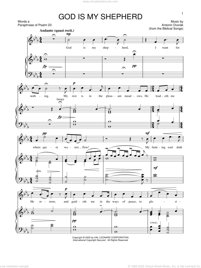 This new feature (still experimental) allows you to ask questions related to this music title to our AI music assistant (powered by OpenAI ChatGPT), trained to answer as an expert on this music title.You may ask questions like "When was this piece written?" or "How would you suggest approaching this piece?" You can also ask questions about the author or anything else you may think of. Just enter your queries inside the field on the top of the displayed music and click the "Ask" button on the left to start chatting. Remember that the assistant cannot perform catalog searches. It is focused only on this music title. It could also give you wrong or imperfect answers. In that case, click the "regenerate" button on the side of the answer to replace it with a new one. And, of course, you can provide feedback for each answer so we can improve the system. ![]() Antonin Dvorak: God Is My Shepherd for voice and piano (High Voice), intermediate voice sheet music. Includes an High-Quality PDF file to download instantly. Licensed to Virtual Sheet Music® by Hal Leonard® publishing company. NOTE: The image above is just a preview of the first page of this item. Buy this item to display, print, and enjoy the complete music. Basic Score Info