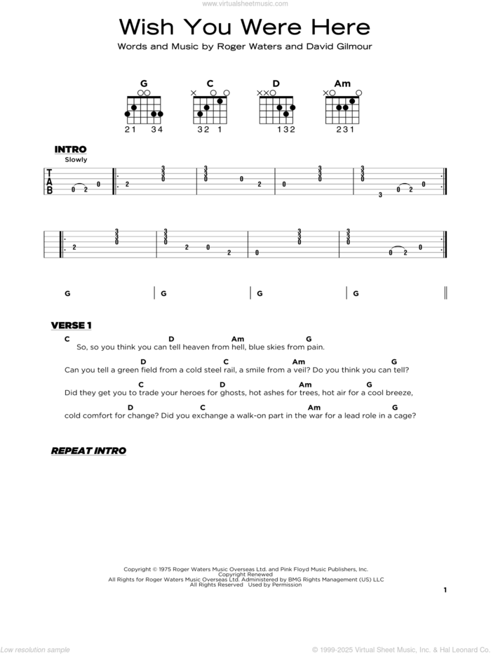 This new feature (still experimental) allows you to ask questions related to this music title to our AI music assistant (powered by OpenAI ChatGPT), trained to answer as an expert on this music title.You may ask questions like "When was this song written?" or "How would you suggest approaching this song?" You can also ask questions about the author or anything else you may think of. Just enter your queries inside the field on the top of the displayed music and click the "Ask" button on the left to start chatting. Remember that the assistant cannot perform catalog searches. It is focused only on this music title. It could also give you wrong or imperfect answers. In that case, click the "regenerate" button on the side of the answer to replace it with a new one. And, of course, you can provide feedback for each answer so we can improve the system. ![]() Pink Floyd: Wish You Were Here for guitar solo, beginner guitar sheet music. Includes an High-Quality PDF file to download instantly. Licensed to Virtual Sheet Music® by Hal Leonard® publishing company. NOTE: The image above is just a preview of the first page of this item. Buy this item to display, print, and enjoy the complete music. Basic Score Info