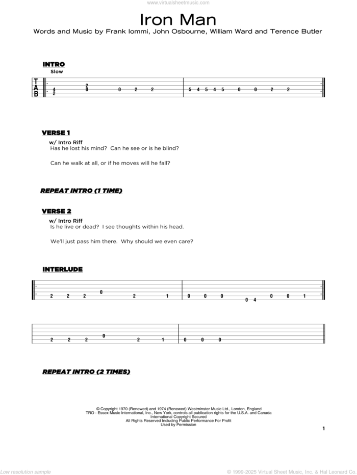 This new feature (still experimental) allows you to ask questions related to this music title to our AI music assistant (powered by OpenAI ChatGPT), trained to answer as an expert on this music title.You may ask questions like "When was this song written?" or "How would you suggest approaching this song?" You can also ask questions about the author or anything else you may think of. Just enter your queries inside the field on the top of the displayed music and click the "Ask" button on the left to start chatting. Remember that the assistant cannot perform catalog searches. It is focused only on this music title. It could also give you wrong or imperfect answers. In that case, click the "regenerate" button on the side of the answer to replace it with a new one. And, of course, you can provide feedback for each answer so we can improve the system. ![]() Black Sabbath: Iron Man for guitar solo, beginner guitar sheet music. Includes an High-Quality PDF file to download instantly. Licensed to Virtual Sheet Music® by Hal Leonard® publishing company. NOTE: The image above is just a preview of the first page of this item. Buy this item to display, print, and enjoy the complete music. Basic Score Info
