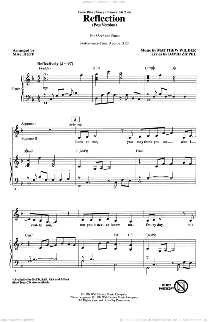 This new feature (still experimental) allows you to ask questions related to this music title to our AI music assistant (powered by OpenAI ChatGPT), trained to answer as an expert on this music title.You may ask questions like "When was this song written?" or "How would you suggest approaching this song?" You can also ask questions about the author or anything else you may think of. Just enter your queries inside the field on the top of the displayed music and click the "Ask" button on the left to start chatting. Remember that the assistant cannot perform catalog searches. It is focused only on this music title. It could also give you wrong or imperfect answers. In that case, click the "regenerate" button on the side of the answer to replace it with a new one. And, of course, you can provide feedback for each answer so we can improve the system. ![]() Christina Aguilera: Reflection (Pop Version) (from Mulan) (arr. Mac Huff) for choir (SSA: soprano, alto), intermediate sheet music. Includes an High-Quality PDF file to download instantly. Licensed to Virtual Sheet Music® by Hal Leonard® publishing company. NOTE: The image above is just a preview of the first page of this item. Buy this item to display, print, and enjoy the complete music. Basic Score Info