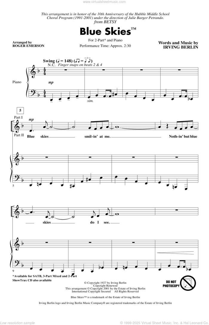 This new feature (still experimental) allows you to ask questions related to this music title to our AI music assistant (powered by OpenAI ChatGPT), trained to answer as an expert on this music title.You may ask questions like "When was this song written?" or "How would you suggest approaching this song?" You can also ask questions about the author or anything else you may think of. Just enter your queries inside the field on the top of the displayed music and click the "Ask" button on the left to start chatting. Remember that the assistant cannot perform catalog searches. It is focused only on this music title. It could also give you wrong or imperfect answers. In that case, click the "regenerate" button on the side of the answer to replace it with a new one. And, of course, you can provide feedback for each answer so we can improve the system. ![]() Irving Berlin: Blue Skies (arr. Roger Emerson) for choir (2-Part), intermediate sheet music. Includes an High-Quality PDF file to download instantly. Licensed to Virtual Sheet Music® by Hal Leonard® publishing company. NOTE: The image above is just a preview of the first page of this item. Buy this item to display, print, and enjoy the complete music. Basic Score Info