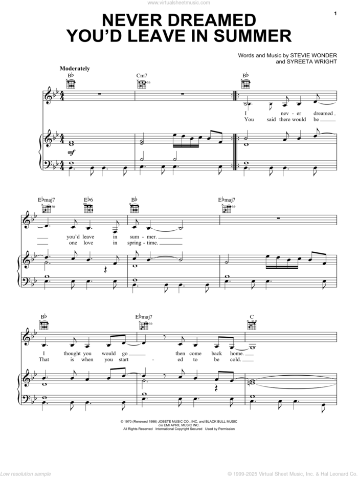 This new feature (still experimental) allows you to ask questions related to this music title to our AI music assistant (powered by OpenAI ChatGPT), trained to answer as an expert on this music title.You may ask questions like "When was this song written?" or "How would you suggest approaching this song?" You can also ask questions about the author or anything else you may think of. Just enter your queries inside the field on the top of the displayed music and click the "Ask" button on the left to start chatting. Remember that the assistant cannot perform catalog searches. It is focused only on this music title. It could also give you wrong or imperfect answers. In that case, click the "regenerate" button on the side of the answer to replace it with a new one. And, of course, you can provide feedback for each answer so we can improve the system. ![]() Stevie Wonder: Never Dreamed You'd Leave In Summer for voice, piano or guitar, intermediate sheet music. High-Quality and Interactive, transposable in any key, play along. Includes an High-Quality PDF file to download instantly. Licensed to Virtual Sheet Music® by Hal Leonard® publishing company. NOTE: The sample above is just the first page preview of this item. Buy this item to display, print, and play the complete music. Basic Score Info