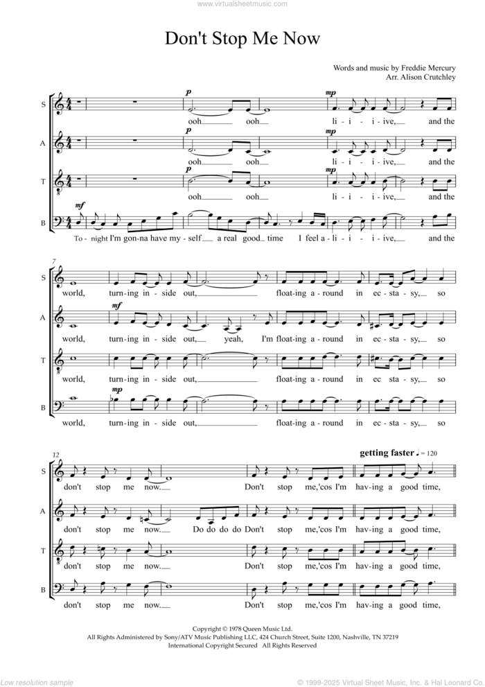 This new feature (still experimental) allows you to ask questions related to this music title to our AI music assistant (powered by OpenAI ChatGPT), trained to answer as an expert on this music title.You may ask questions like "When was this song written?" or "How would you suggest approaching this song?" You can also ask questions about the author or anything else you may think of. Just enter your queries inside the field on the top of the displayed music and click the "Ask" button on the left to start chatting. Remember that the assistant cannot perform catalog searches. It is focused only on this music title. It could also give you wrong or imperfect answers. In that case, click the "regenerate" button on the side of the answer to replace it with a new one. And, of course, you can provide feedback for each answer so we can improve the system. ![]() Queen: Don't Stop Me Now (arr. Alison Crutchley) for choir (SATB: soprano, alto, tenor, bass), intermediate sheet music. Includes an High-Quality PDF file to download instantly. Licensed to Virtual Sheet Music® by Hal Leonard® publishing company. NOTE: The image above is just a preview of the first page of this item. Buy this item to display, print, and enjoy the complete music. Basic Score Info
