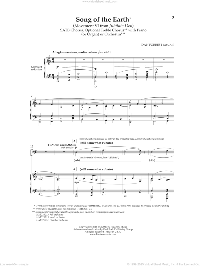 This new feature (still experimental) allows you to ask questions related to this music title to our AI music assistant (powered by OpenAI ChatGPT), trained to answer as an expert on this music title.You may ask questions like "When was this song written?" or "How would you suggest approaching this song?" You can also ask questions about the author or anything else you may think of. Just enter your queries inside the field on the top of the displayed music and click the "Ask" button on the left to start chatting. Remember that the assistant cannot perform catalog searches. It is focused only on this music title. It could also give you wrong or imperfect answers. In that case, click the "regenerate" button on the side of the answer to replace it with a new one. And, of course, you can provide feedback for each answer so we can improve the system. ![]() Dan Forrest: Song Of The Earth (Movement VI) (from Jubilate Deo) for choir (SATB: soprano, alto, tenor, bass), intermediate sheet music. Includes an High-Quality PDF file to download instantly. Licensed to Virtual Sheet Music® by Hal Leonard® publishing company. NOTE: The image above is just a preview of the first page of this item. Buy this item to display, print, and enjoy the complete music. Basic Score Info