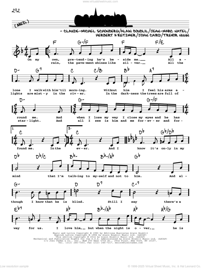 This new feature (still experimental) allows you to ask questions related to this music title to our AI music assistant (powered by OpenAI ChatGPT), trained to answer as an expert on this music title.You may ask questions like "When was this song written?" or "How would you suggest approaching this song?" You can also ask questions about the author or anything else you may think of. Just enter your queries inside the field on the top of the displayed music and click the "Ask" button on the left to start chatting. Remember that the assistant cannot perform catalog searches. It is focused only on this music title. It could also give you wrong or imperfect answers. In that case, click the "regenerate" button on the side of the answer to replace it with a new one. And, of course, you can provide feedback for each answer so we can improve the system. ![]() Alain Boublil: On My Own (from Les Miserables) (High Voice) for voice and other instruments (high voice), intermediate voice sheet music. Includes an High-Quality PDF file to download instantly. Licensed to Virtual Sheet Music® by Hal Leonard® publishing company. NOTE: The image above is just a preview of the first page of this item. Buy this item to display, print, and enjoy the complete music. Basic Score Info