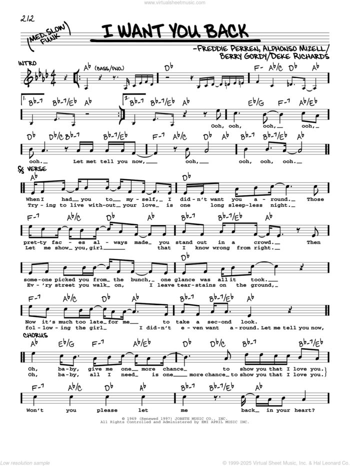 This new feature (still experimental) allows you to ask questions related to this music title to our AI music assistant (powered by OpenAI ChatGPT), trained to answer as an expert on this music title.You may ask questions like "When was this song written?" or "How would you suggest approaching this song?" You can also ask questions about the author or anything else you may think of. Just enter your queries inside the field on the top of the displayed music and click the "Ask" button on the left to start chatting. Remember that the assistant cannot perform catalog searches. It is focused only on this music title. It could also give you wrong or imperfect answers. In that case, click the "regenerate" button on the side of the answer to replace it with a new one. And, of course, you can provide feedback for each answer so we can improve the system. ![]() The Jackson 5: I Want You Back for voice and other instruments (real book), intermediate voice sheet music. Includes an High-Quality PDF file to download instantly. Licensed to Virtual Sheet Music® by Hal Leonard® publishing company. NOTE: The image above is just a preview of the first page of this item. Buy this item to display, print, and enjoy the complete music. Basic Score Info