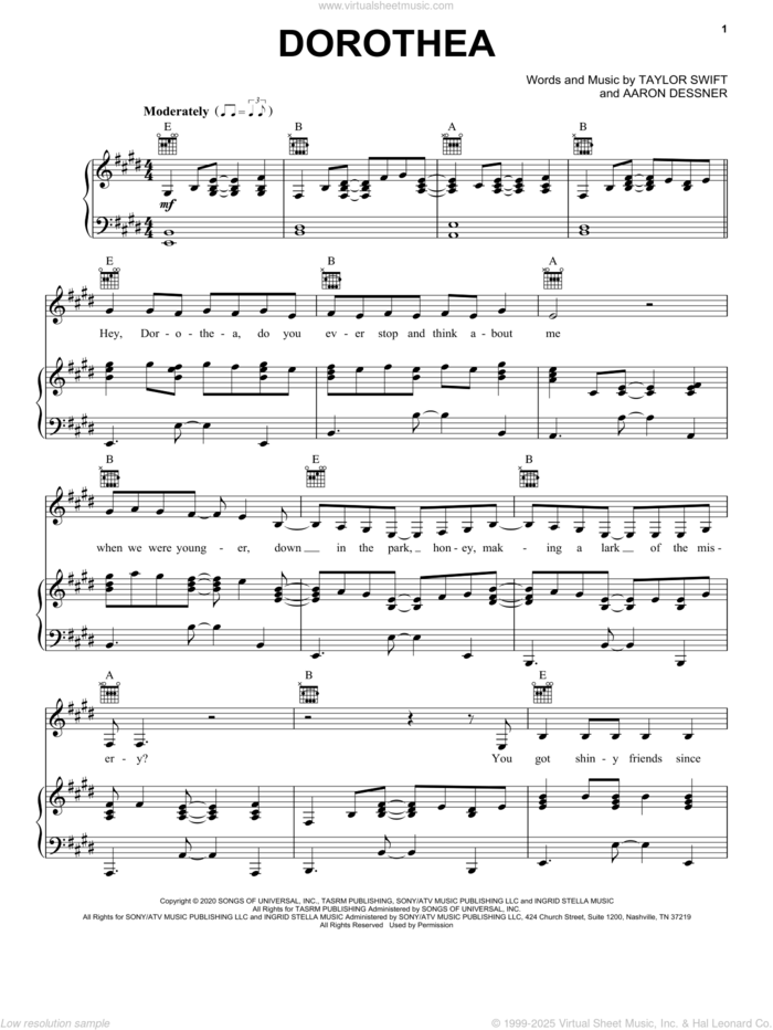 This new feature (still experimental) allows you to ask questions related to this music title to our AI music assistant (powered by OpenAI ChatGPT), trained to answer as an expert on this music title.You may ask questions like "When was this song written?" or "How would you suggest approaching this song?" You can also ask questions about the author or anything else you may think of. Just enter your queries inside the field on the top of the displayed music and click the "Ask" button on the left to start chatting. Remember that the assistant cannot perform catalog searches. It is focused only on this music title. It could also give you wrong or imperfect answers. In that case, click the "regenerate" button on the side of the answer to replace it with a new one. And, of course, you can provide feedback for each answer so we can improve the system. ![]() Taylor Swift: dorothea for voice, piano or guitar, intermediate sheet music. High-Quality and Interactive, transposable in any key, play along. Includes an High-Quality PDF file to download instantly. Licensed to Virtual Sheet Music® by Hal Leonard® publishing company. NOTE: The sample above is just the first page preview of this item. Buy this item to display, print, and play the complete music. Basic Score Info