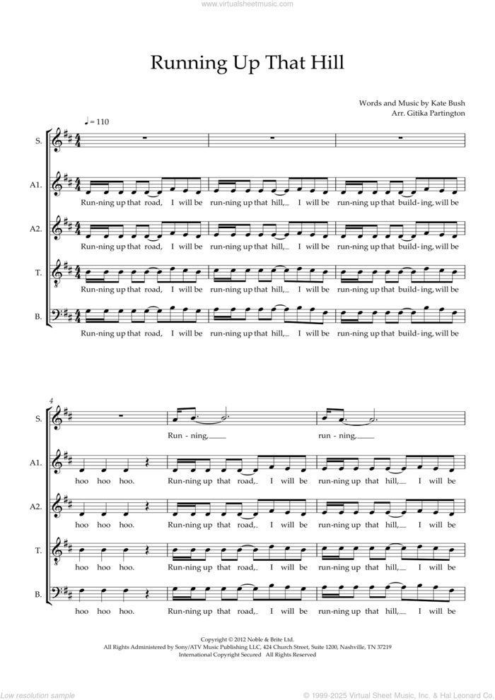 This new feature (still experimental) allows you to ask questions related to this music title to our AI music assistant (powered by OpenAI ChatGPT), trained to answer as an expert on this music title.You may ask questions like "When was this song written?" or "How would you suggest approaching this song?" You can also ask questions about the author or anything else you may think of. Just enter your queries inside the field on the top of the displayed music and click the "Ask" button on the left to start chatting. Remember that the assistant cannot perform catalog searches. It is focused only on this music title. It could also give you wrong or imperfect answers. In that case, click the "regenerate" button on the side of the answer to replace it with a new one. And, of course, you can provide feedback for each answer so we can improve the system. ![]() Kate Bush: Running Up That Hill (A Deal With God) 2012 Remix (arr. Gitika Partington) for choir (SAATB), intermediate sheet music. Includes an High-Quality PDF file to download instantly. Licensed to Virtual Sheet Music® by Hal Leonard® publishing company. NOTE: The image above is just a preview of the first page of this item. Buy this item to display, print, and enjoy the complete music. Basic Score Info