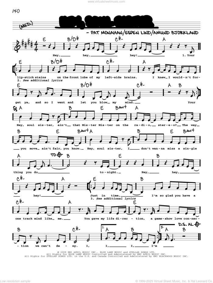 Train: Hey, Soul Sister for voice and other instruments (real book with lyrics), intermediate voice sheet music. Includes an High-Quality PDF file to download instantly. Licensed to Virtual Sheet Music® by Hal Leonard® publishing company.