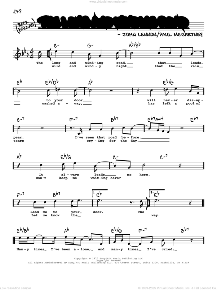 This new feature (still experimental) allows you to ask questions related to this music title to our AI music assistant (powered by OpenAI ChatGPT), trained to answer as an expert on this music title.You may ask questions like "When was this song written?" or "How would you suggest approaching this song?" You can also ask questions about the author or anything else you may think of. Just enter your queries inside the field on the top of the displayed music and click the "Ask" button on the left to start chatting. Remember that the assistant cannot perform catalog searches. It is focused only on this music title. It could also give you wrong or imperfect answers. In that case, click the "regenerate" button on the side of the answer to replace it with a new one. And, of course, you can provide feedback for each answer so we can improve the system. ![]() The Beatles: The Long And Winding Road for voice and other instruments (real book with lyrics), intermediate voice sheet music. Includes an High-Quality PDF file to download instantly. Licensed to Virtual Sheet Music® by Hal Leonard® publishing company. NOTE: The image above is just a preview of the first page of this item. Buy this item to display, print, and enjoy the complete music. Basic Score Info