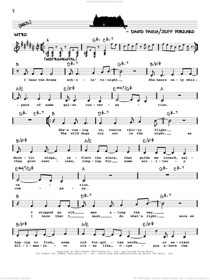 This new feature (still experimental) allows you to ask questions related to this music title to our AI music assistant (powered by OpenAI ChatGPT), trained to answer as an expert on this music title.You may ask questions like "When was this song written?" or "How would you suggest approaching this song?" You can also ask questions about the author or anything else you may think of. Just enter your queries inside the field on the top of the displayed music and click the "Ask" button on the left to start chatting. Remember that the assistant cannot perform catalog searches. It is focused only on this music title. It could also give you wrong or imperfect answers. In that case, click the "regenerate" button on the side of the answer to replace it with a new one. And, of course, you can provide feedback for each answer so we can improve the system. ![]() Toto: Africa for voice and other instruments (real book with lyrics), intermediate voice sheet music. Includes an High-Quality PDF file to download instantly. Licensed to Virtual Sheet Music® by Hal Leonard® publishing company. NOTE: The image above is just a preview of the first page of this item. Buy this item to display, print, and enjoy the complete music. Basic Score Info