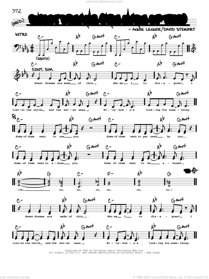 This new feature (still experimental) allows you to ask questions related to this music title to our AI music assistant (powered by OpenAI ChatGPT), trained to answer as an expert on this music title.You may ask questions like "When was this song written?" or "How would you suggest approaching this song?" You can also ask questions about the author or anything else you may think of. Just enter your queries inside the field on the top of the displayed music and click the "Ask" button on the left to start chatting. Remember that the assistant cannot perform catalog searches. It is focused only on this music title. It could also give you wrong or imperfect answers. In that case, click the "regenerate" button on the side of the answer to replace it with a new one. And, of course, you can provide feedback for each answer so we can improve the system. ![]() Eurythmics: Sweet Dreams (Are Made Of This) for voice and other instruments (real book with lyrics), intermediate voice sheet music. Includes an High-Quality PDF file to download instantly. Licensed to Virtual Sheet Music® by Hal Leonard® publishing company. NOTE: The image above is just a preview of the first page of this item. Buy this item to display, print, and enjoy the complete music. Basic Score Info