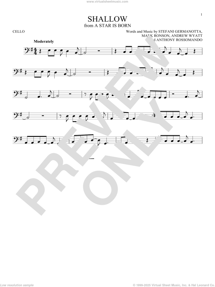 This new feature (still experimental) allows you to ask questions related to this music title to our AI music assistant (powered by OpenAI ChatGPT), trained to answer as an expert on this music title.You may ask questions like "When was this song written?" or "How would you suggest approaching this song?" You can also ask questions about the author or anything else you may think of. Just enter your queries inside the field on the top of the displayed music and click the "Ask" button on the left to start chatting. Remember that the assistant cannot perform catalog searches. It is focused only on this music title. It could also give you wrong or imperfect answers. In that case, click the "regenerate" button on the side of the answer to replace it with a new one. And, of course, you can provide feedback for each answer so we can improve the system. ![]() Lady Gaga & Bradley Cooper: Shallow (from A Star Is Born) for cello solo, intermediate cello sheet music. High-Quality and Interactive, transposable in any key, play along. Includes an High-Quality PDF file to download instantly. Licensed to Virtual Sheet Music® by Hal Leonard® publishing company. NOTE: The sample above is just the first page preview of this item. Buy this item to display, print, and play the complete music. Basic Score Info