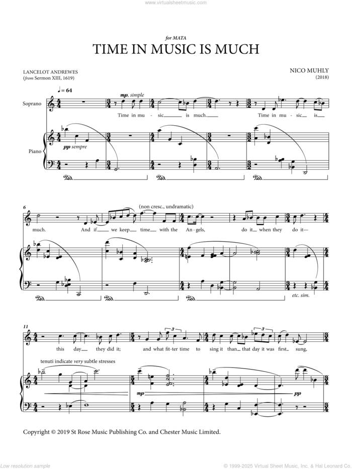 This new feature (still experimental) allows you to ask questions related to this music title to our AI music assistant (powered by OpenAI ChatGPT), trained to answer as an expert on this music title.You may ask questions like "When was this piece written?" or "How would you suggest approaching this piece?" You can also ask questions about the author or anything else you may think of. Just enter your queries inside the field on the top of the displayed music and click the "Ask" button on the left to start chatting. Remember that the assistant cannot perform catalog searches. It is focused only on this music title. It could also give you wrong or imperfect answers. In that case, click the "regenerate" button on the side of the answer to replace it with a new one. And, of course, you can provide feedback for each answer so we can improve the system. ![]() Nico Muhly: Time In Music Is Much for voice and piano, intermediate voice sheet music. Includes an High-Quality PDF file to download instantly. Licensed to Virtual Sheet Music® by Hal Leonard® publishing company. NOTE: The image above is just a preview of the first page of this item. Buy this item to display, print, and enjoy the complete music. Basic Score Info
