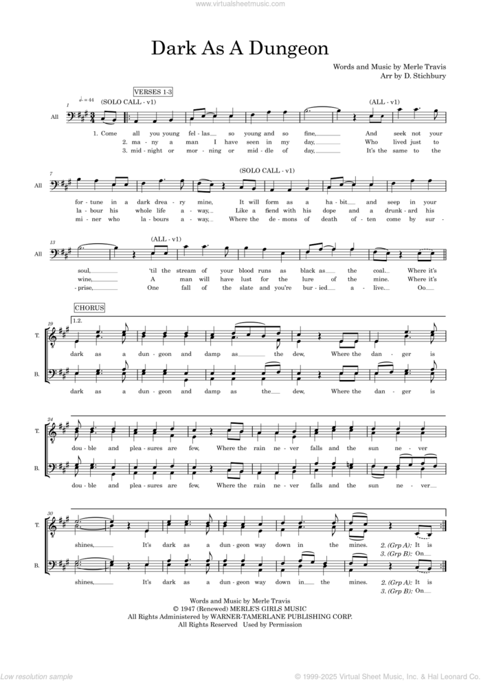 This new feature (still experimental) allows you to ask questions related to this music title to our AI music assistant (powered by OpenAI ChatGPT), trained to answer as an expert on this music title.You may ask questions like "When was this song written?" or "How would you suggest approaching this song?" You can also ask questions about the author or anything else you may think of. Just enter your queries inside the field on the top of the displayed music and click the "Ask" button on the left to start chatting. Remember that the assistant cannot perform catalog searches. It is focused only on this music title. It could also give you wrong or imperfect answers. In that case, click the "regenerate" button on the side of the answer to replace it with a new one. And, of course, you can provide feedback for each answer so we can improve the system. ![]() Merle Travis: Dark As A Dungeon (arr. Dom Stichbury) for choir (TTBB: tenor, bass), intermediate sheet music. Includes an High-Quality PDF file to download instantly. Licensed to Virtual Sheet Music® by Hal Leonard® publishing company. NOTE: The image above is just a preview of the first page of this item. Buy this item to display, print, and enjoy the complete music. Basic Score Info