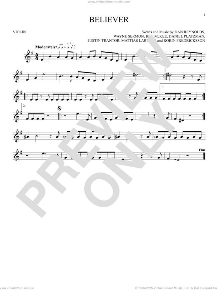 This new feature (still experimental) allows you to ask questions related to this music title to our AI music assistant (powered by OpenAI ChatGPT), trained to answer as an expert on this music title.You may ask questions like "When was this song written?" or "How would you suggest approaching this song?" You can also ask questions about the author or anything else you may think of. Just enter your queries inside the field on the top of the displayed music and click the "Ask" button on the left to start chatting. Remember that the assistant cannot perform catalog searches. It is focused only on this music title. It could also give you wrong or imperfect answers. In that case, click the "regenerate" button on the side of the answer to replace it with a new one. And, of course, you can provide feedback for each answer so we can improve the system. ![]() Imagine Dragons: Believer for violin solo, intermediate violin sheet music. High-Quality and Interactive, transposable in any key, play along. Includes an High-Quality PDF file to download instantly. Licensed to Virtual Sheet Music® by Hal Leonard® publishing company. NOTE: The sample above is just the first page preview of this item. Buy this item to display, print, and play the complete music. Basic Score Info