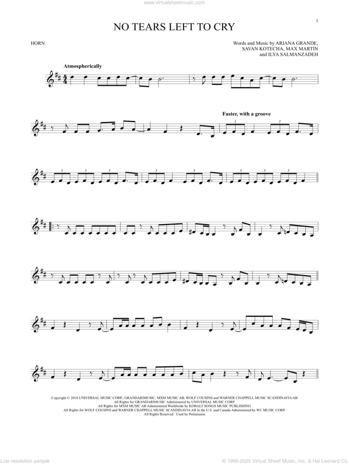 This new feature (still experimental) allows you to ask questions related to this music title to our AI music assistant (powered by OpenAI ChatGPT), trained to answer as an expert on this music title.You may ask questions like "When was this song written?" or "How would you suggest approaching this song?" You can also ask questions about the author or anything else you may think of. Just enter your queries inside the field on the top of the displayed music and click the "Ask" button on the left to start chatting. Remember that the assistant cannot perform catalog searches. It is focused only on this music title. It could also give you wrong or imperfect answers. In that case, click the "regenerate" button on the side of the answer to replace it with a new one. And, of course, you can provide feedback for each answer so we can improve the system. ![]() Ariana Grande: No Tears Left To Cry for horn solo, intermediate horn sheet music. High-Quality and Interactive, transposable in any key, play along. Includes an High-Quality PDF file to download instantly. Licensed to Virtual Sheet Music® by Hal Leonard® publishing company. NOTE: The sample above is just the first page preview of this item. Buy this item to display, print, and play the complete music. Basic Score Info
