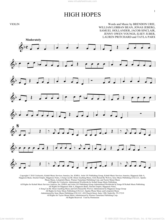 This new feature (still experimental) allows you to ask questions related to this music title to our AI music assistant (powered by OpenAI ChatGPT), trained to answer as an expert on this music title.You may ask questions like "When was this song written?" or "How would you suggest approaching this song?" You can also ask questions about the author or anything else you may think of. Just enter your queries inside the field on the top of the displayed music and click the "Ask" button on the left to start chatting. Remember that the assistant cannot perform catalog searches. It is focused only on this music title. It could also give you wrong or imperfect answers. In that case, click the "regenerate" button on the side of the answer to replace it with a new one. And, of course, you can provide feedback for each answer so we can improve the system. ![]() Panic! At The Disco: High Hopes for violin solo, intermediate violin sheet music. High-Quality and Interactive, transposable in any key, play along. Includes an High-Quality PDF file to download instantly. Licensed to Virtual Sheet Music® by Hal Leonard® publishing company. NOTE: The sample above is just the first page preview of this item. Buy this item to display, print, and play the complete music. Basic Score Info