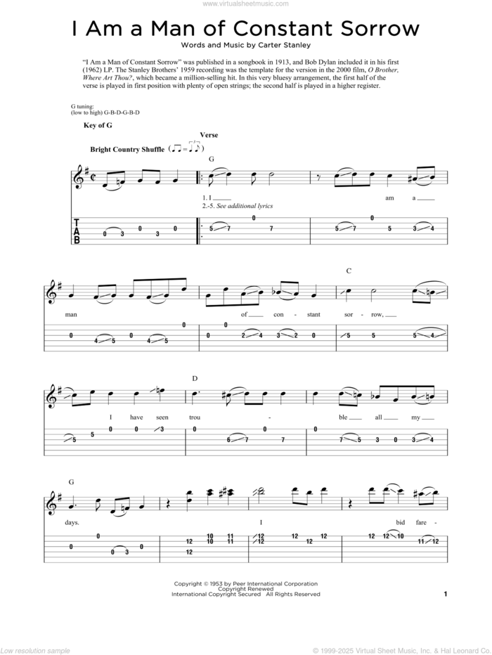 I Am A Man Of Constant Sorrow sheet music for dobro solo by The Soggy Bottom Boys, Fred Sokolow, Carter Stanley and Ralph Stanley, easy skill level