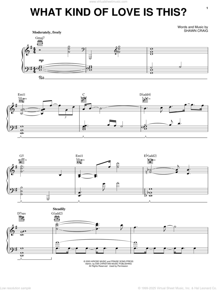 This new feature (still experimental) allows you to ask questions related to this music title to our AI music assistant (powered by OpenAI ChatGPT), trained to answer as an expert on this music title.You may ask questions like "When was this song written?" or "How would you suggest approaching this song?" You can also ask questions about the author or anything else you may think of. Just enter your queries inside the field on the top of the displayed music and click the "Ask" button on the left to start chatting. Remember that the assistant cannot perform catalog searches. It is focused only on this music title. It could also give you wrong or imperfect answers. In that case, click the "regenerate" button on the side of the answer to replace it with a new one. And, of course, you can provide feedback for each answer so we can improve the system. ![]() Phillips, Craig & Dean: What Kind Of Love Is This for voice, piano or guitar, intermediate sheet music. High-Quality and Interactive, transposable in any key, play along. Includes an High-Quality PDF file to download instantly. Licensed to Virtual Sheet Music® by Hal Leonard® publishing company. NOTE: The sample above is just the first page preview of this item. Buy this item to display, print, and play the complete music. Basic Score Info