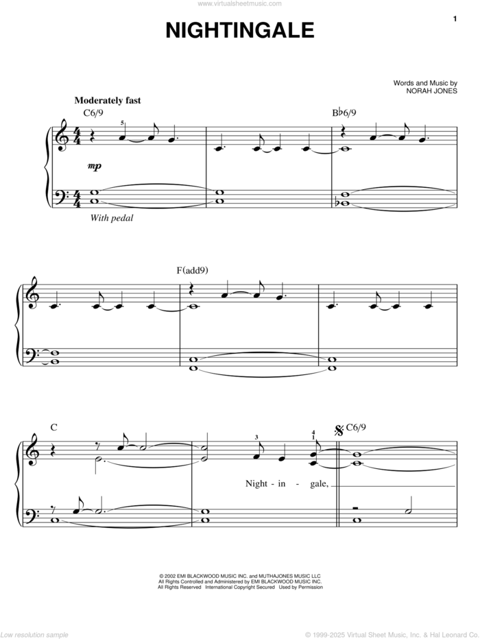 This new feature (still experimental) allows you to ask questions related to this music title to our AI music assistant (powered by OpenAI ChatGPT), trained to answer as an expert on this music title.You may ask questions like "When was this song written?" or "How would you suggest approaching this song?" You can also ask questions about the author or anything else you may think of. Just enter your queries inside the field on the top of the displayed music and click the "Ask" button on the left to start chatting. Remember that the assistant cannot perform catalog searches. It is focused only on this music title. It could also give you wrong or imperfect answers. In that case, click the "regenerate" button on the side of the answer to replace it with a new one. And, of course, you can provide feedback for each answer so we can improve the system. ![]() Norah Jones: Nightingale, (easy) for piano solo, easy piano sheet music. High-Quality and Interactive, transposable in any key, play along. Includes an High-Quality PDF file to download instantly. Licensed to Virtual Sheet Music® by Hal Leonard® publishing company. NOTE: The sample above is just the first page preview of this item. Buy this item to display, print, and play the complete music. Basic Score Info