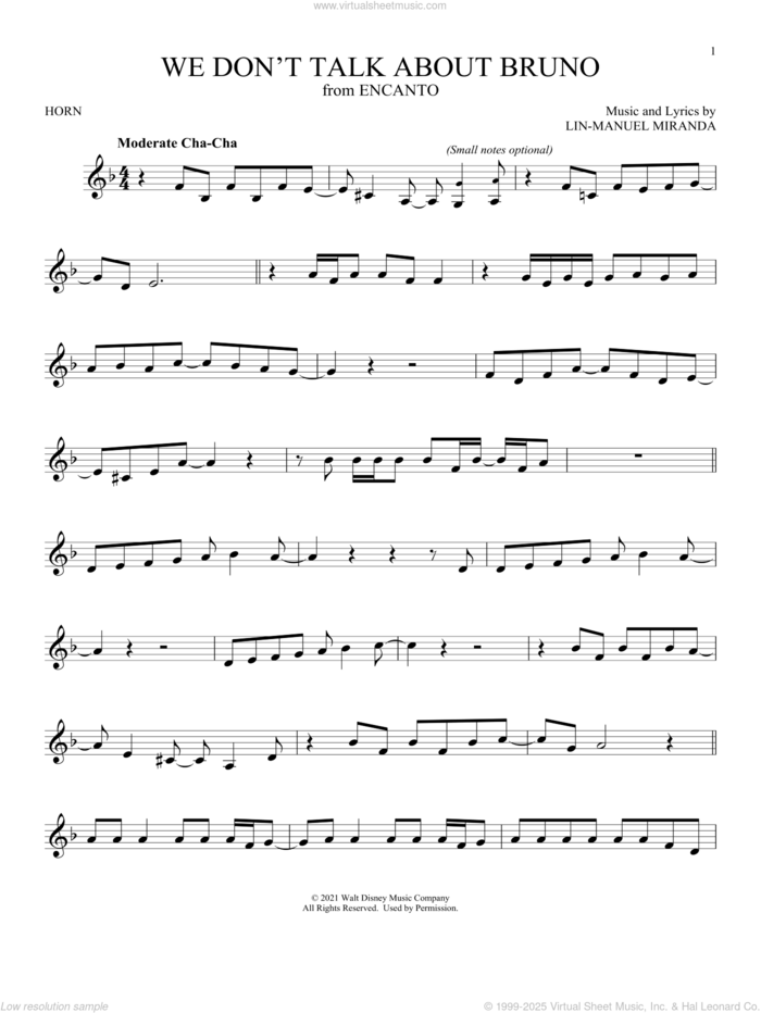 This new feature (still experimental) allows you to ask questions related to this music title to our AI music assistant (powered by OpenAI ChatGPT), trained to answer as an expert on this music title.You may ask questions like "When was this song written?" or "How would you suggest approaching this song?" You can also ask questions about the author or anything else you may think of. Just enter your queries inside the field on the top of the displayed music and click the "Ask" button on the left to start chatting. Remember that the assistant cannot perform catalog searches. It is focused only on this music title. It could also give you wrong or imperfect answers. In that case, click the "regenerate" button on the side of the answer to replace it with a new one. And, of course, you can provide feedback for each answer so we can improve the system. ![]() Lin-Manuel Miranda: We Don't Talk About Bruno (from Encanto) for horn solo, intermediate horn sheet music. High-Quality and Interactive, transposable in any key, play along. Includes an High-Quality PDF file to download instantly. Licensed to Virtual Sheet Music® by Hal Leonard® publishing company. NOTE: The sample above is just the first page preview of this item. Buy this item to display, print, and play the complete music. Basic Score Info