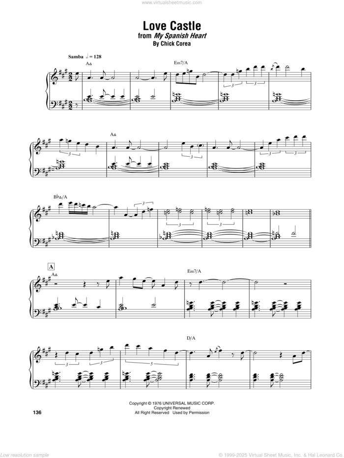 This new feature (still experimental) allows you to ask questions related to this music title to our AI music assistant (powered by OpenAI ChatGPT), trained to answer as an expert on this music title.You may ask questions like "When was this song written?" or "How would you suggest approaching this song?" You can also ask questions about the author or anything else you may think of. Just enter your queries inside the field on the top of the displayed music and click the "Ask" button on the left to start chatting. Remember that the assistant cannot perform catalog searches. It is focused only on this music title. It could also give you wrong or imperfect answers. In that case, click the "regenerate" button on the side of the answer to replace it with a new one. And, of course, you can provide feedback for each answer so we can improve the system. ![]() Chick Corea: Love Castle for piano solo (transcription), intermediate piano (transcription) sheet music. Includes an High-Quality PDF file to download instantly. Licensed to Virtual Sheet Music® by Hal Leonard® publishing company. NOTE: The image above is just a preview of the first page of this item. Buy this item to display, print, and enjoy the complete music. Basic Score Info