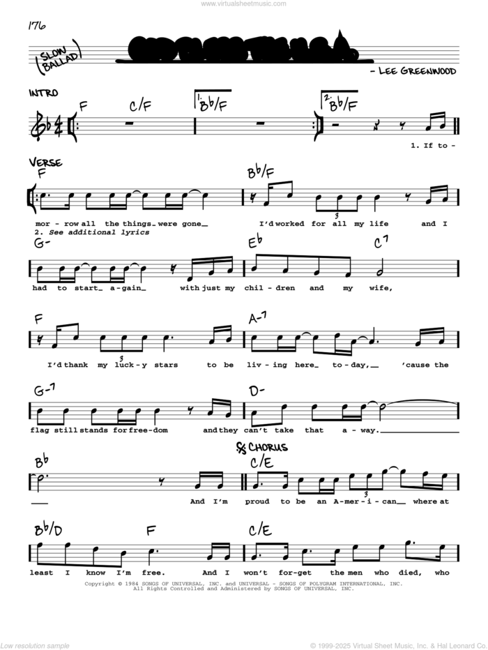 This new feature (still experimental) allows you to ask questions related to this music title to our AI music assistant (powered by OpenAI ChatGPT), trained to answer as an expert on this music title.You may ask questions like "When was this song written?" or "How would you suggest approaching this song?" You can also ask questions about the author or anything else you may think of. Just enter your queries inside the field on the top of the displayed music and click the "Ask" button on the left to start chatting. Remember that the assistant cannot perform catalog searches. It is focused only on this music title. It could also give you wrong or imperfect answers. In that case, click the "regenerate" button on the side of the answer to replace it with a new one. And, of course, you can provide feedback for each answer so we can improve the system. ![]() Lee Greenwood: God Bless The U.S.A. for voice and other instruments (real book with lyrics), intermediate voice sheet music. Includes an High-Quality PDF file to download instantly. Licensed to Virtual Sheet Music® by Hal Leonard® publishing company. NOTE: The image above is just a preview of the first page of this item. Buy this item to display, print, and enjoy the complete music. Basic Score Info