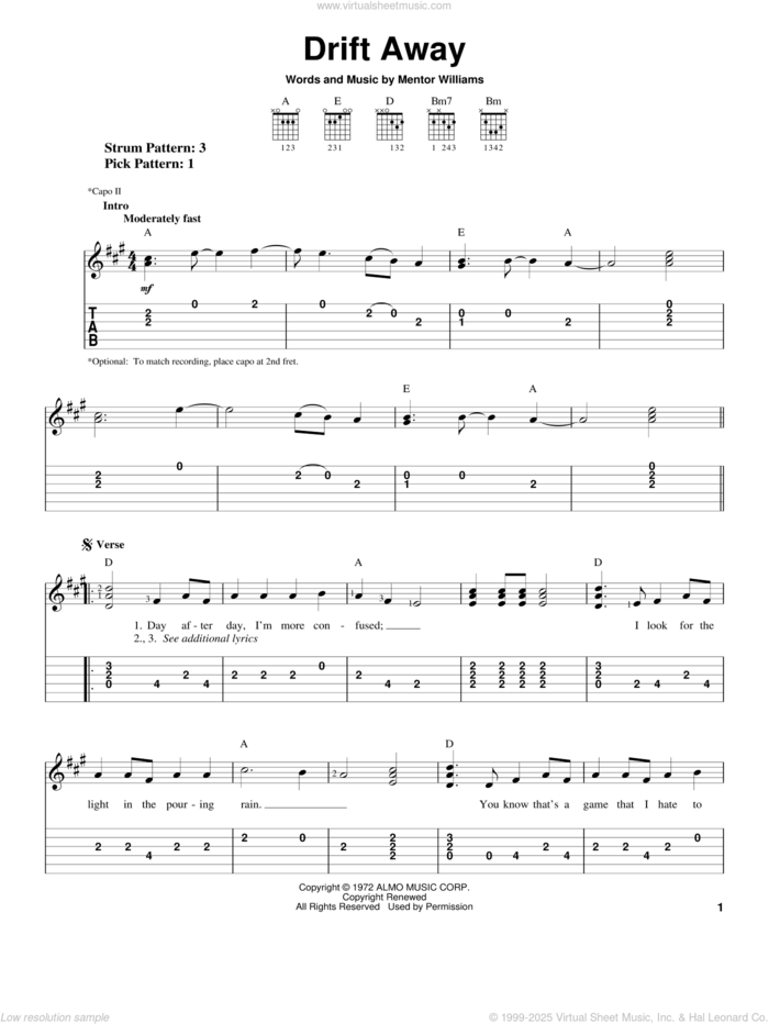 Drift Away sheet music for guitar (easy tablature)
