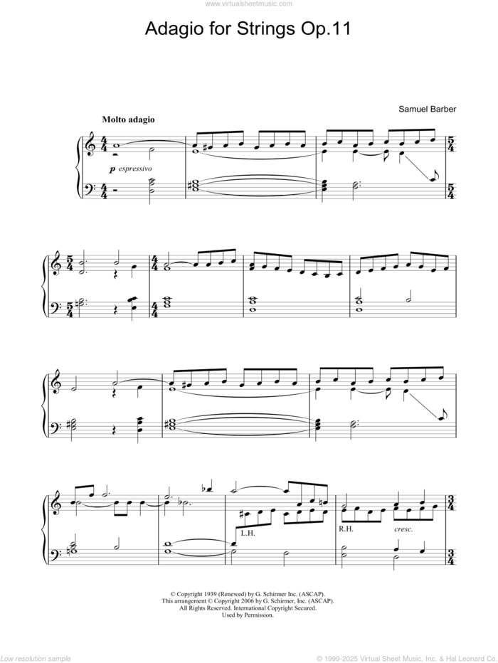 This new feature (still experimental) allows you to ask questions related to this music title to our AI music assistant (powered by OpenAI ChatGPT), trained to answer as an expert on this music title.You may ask questions like "When was this piece written?" or "How would you suggest approaching this piece?" You can also ask questions about the author or anything else you may think of. Just enter your queries inside the field on the top of the displayed music and click the "Ask" button on the left to start chatting. Remember that the assistant cannot perform catalog searches. It is focused only on this music title. It could also give you wrong or imperfect answers. In that case, click the "regenerate" button on the side of the answer to replace it with a new one. And, of course, you can provide feedback for each answer so we can improve the system. ![]() Samuel Barber: Adagio For Strings Op.11 for piano solo, easy piano sheet music. Includes an High-Quality PDF file to download instantly. Licensed to Virtual Sheet Music® by Hal Leonard® publishing company. NOTE: The image above is just a preview of the first page of this item. Buy this item to display, print, and enjoy the complete music. Basic Score Info