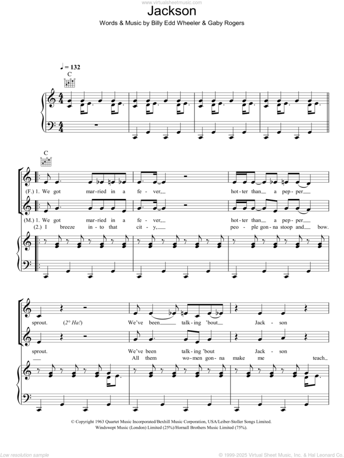 This new feature (still experimental) allows you to ask questions related to this music title to our AI music assistant (powered by OpenAI ChatGPT), trained to answer as an expert on this music title.You may ask questions like "When was this song written?" or "How would you suggest approaching this song?" You can also ask questions about the author or anything else you may think of. Just enter your queries inside the field on the top of the displayed music and click the "Ask" button on the left to start chatting. Remember that the assistant cannot perform catalog searches. It is focused only on this music title. It could also give you wrong or imperfect answers. In that case, click the "regenerate" button on the side of the answer to replace it with a new one. And, of course, you can provide feedback for each answer so we can improve the system. ![]() Johnny Cash & June Carter: Jackson for voice, piano or guitar, intermediate sheet music. Includes an High-Quality PDF file to download instantly. Licensed to Virtual Sheet Music® by Hal Leonard® publishing company. NOTE: The image above is just a preview of the first page of this item. Buy this item to display, print, and enjoy the complete music. Basic Score Info