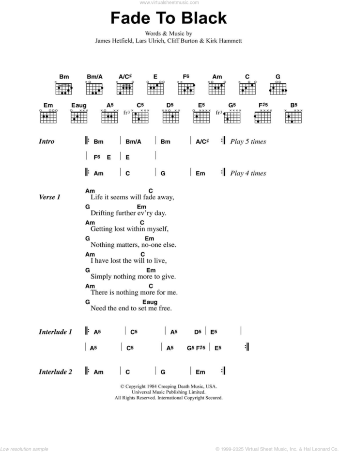 This new feature (still experimental) allows you to ask questions related to this music title to our AI music assistant (powered by OpenAI ChatGPT), trained to answer as an expert on this music title.You may ask questions like "When was this song written?" or "How would you suggest approaching this song?" You can also ask questions about the author or anything else you may think of. Just enter your queries inside the field on the top of the displayed music and click the "Ask" button on the left to start chatting. Remember that the assistant cannot perform catalog searches. It is focused only on this music title. It could also give you wrong or imperfect answers. In that case, click the "regenerate" button on the side of the answer to replace it with a new one. And, of course, you can provide feedback for each answer so we can improve the system. ![]() Metallica: Fade To Black for guitar (chords), intermediate sheet music. Includes an High-Quality PDF file to download instantly. Licensed to Virtual Sheet Music® by Hal Leonard® publishing company. NOTE: The image above is just a preview of the first page of this item. Buy this item to display, print, and enjoy the complete music. Basic Score Info