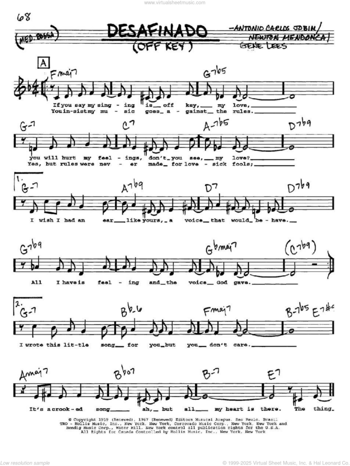 Antonio Carlos Jobim: Desafinado (Off Key) for voice and other instruments , intermediate voice sheet music. Includes an High-Quality PDF file to download instantly. Licensed to Virtual Sheet Music® by Hal Leonard® publishing company.
