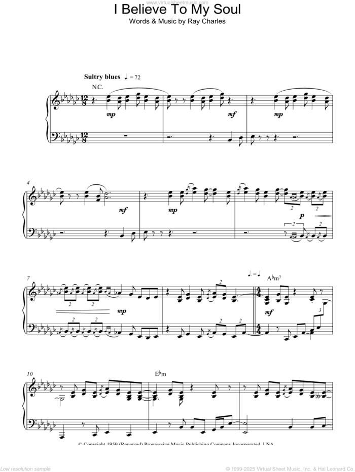 This new feature (still experimental) allows you to ask questions related to this music title to our AI music assistant (powered by OpenAI ChatGPT), trained to answer as an expert on this music title.You may ask questions like "When was this song written?" or "How would you suggest approaching this song?" You can also ask questions about the author or anything else you may think of. Just enter your queries inside the field on the top of the displayed music and click the "Ask" button on the left to start chatting. Remember that the assistant cannot perform catalog searches. It is focused only on this music title. It could also give you wrong or imperfect answers. In that case, click the "regenerate" button on the side of the answer to replace it with a new one. And, of course, you can provide feedback for each answer so we can improve the system. ![]() Ray Charles: I Believe To My Soul for piano solo, intermediate piano sheet music. Includes an High-Quality PDF file to download instantly. Licensed to Virtual Sheet Music® by Hal Leonard® publishing company. NOTE: The image above is just a preview of the first page of this item. Buy this item to display, print, and enjoy the complete music. Basic Score Info