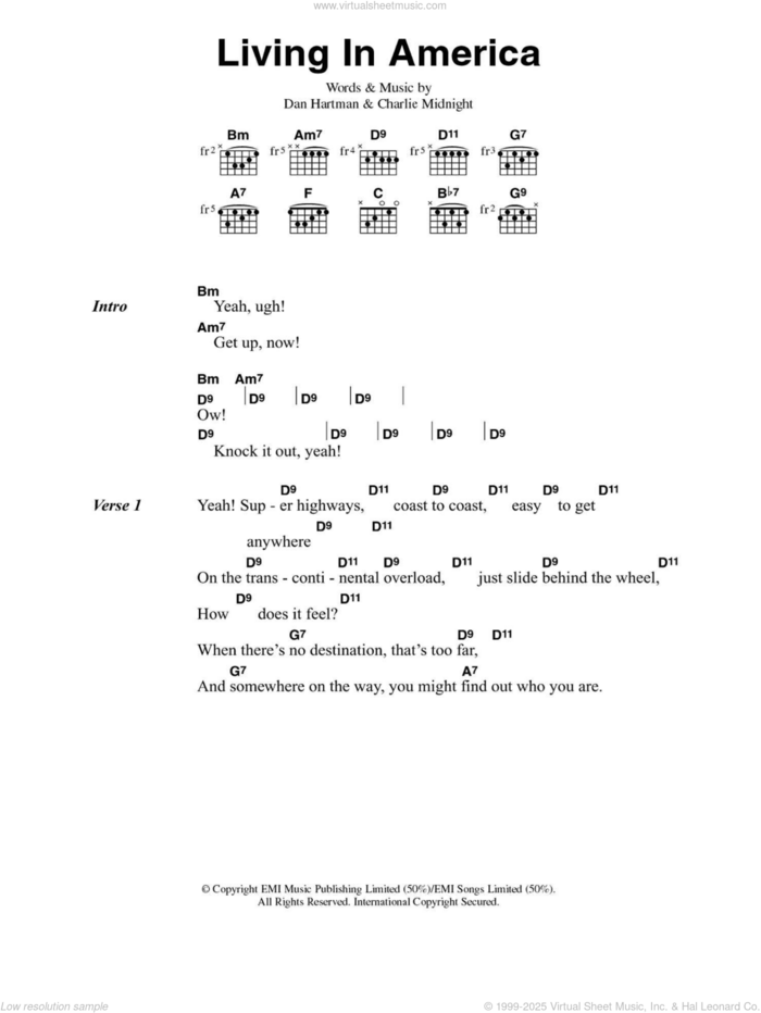 This new feature (still experimental) allows you to ask questions related to this music title to our AI music assistant (powered by OpenAI ChatGPT), trained to answer as an expert on this music title.You may ask questions like "When was this song written?" or "How would you suggest approaching this song?" You can also ask questions about the author or anything else you may think of. Just enter your queries inside the field on the top of the displayed music and click the "Ask" button on the left to start chatting. Remember that the assistant cannot perform catalog searches. It is focused only on this music title. It could also give you wrong or imperfect answers. In that case, click the "regenerate" button on the side of the answer to replace it with a new one. And, of course, you can provide feedback for each answer so we can improve the system. ![]() James Brown: Living In America for guitar (chords), intermediate sheet music. Includes an High-Quality PDF file to download instantly. Licensed to Virtual Sheet Music® by Hal Leonard® publishing company. NOTE: The image above is just a preview of the first page of this item. Buy this item to display, print, and enjoy the complete music. Basic Score Info