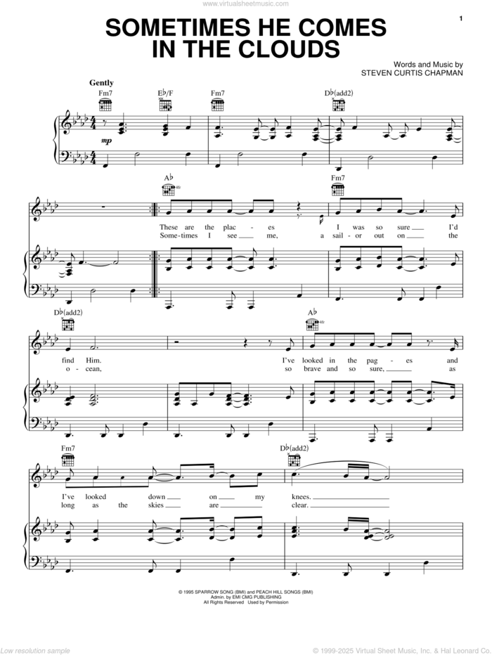 This new feature (still experimental) allows you to ask questions related to this music title to our AI music assistant (powered by OpenAI ChatGPT), trained to answer as an expert on this music title.You may ask questions like "When was this song written?" or "How would you suggest approaching this song?" You can also ask questions about the author or anything else you may think of. Just enter your queries inside the field on the top of the displayed music and click the "Ask" button on the left to start chatting. Remember that the assistant cannot perform catalog searches. It is focused only on this music title. It could also give you wrong or imperfect answers. In that case, click the "regenerate" button on the side of the answer to replace it with a new one. And, of course, you can provide feedback for each answer so we can improve the system. ![]() Steven Curtis Chapman: Sometimes He Comes In The Clouds for voice, piano or guitar, intermediate sheet music. Includes an High-Quality PDF file to download instantly. Licensed to Virtual Sheet Music® by Hal Leonard® publishing company. NOTE: The image above is just a preview of the first page of this item. Buy this item to display, print, and enjoy the complete music. Basic Score Info